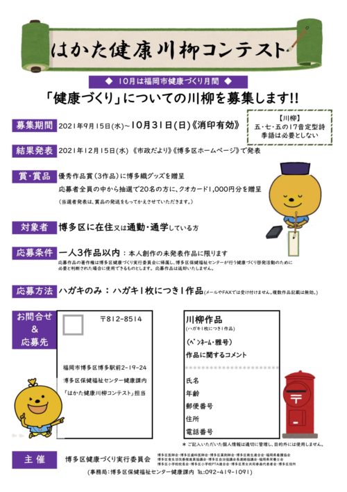 今年は、健康づくりにつながる取り組みとして「はかた健康川柳コンテスト」が代替企画されています。