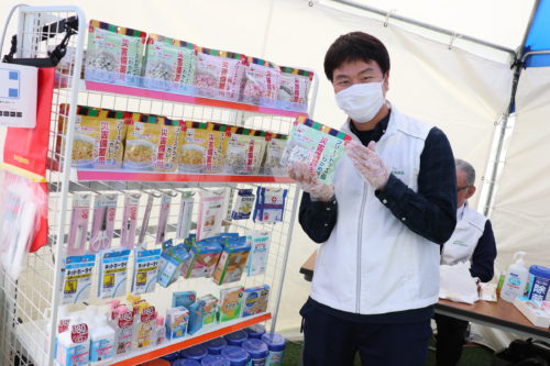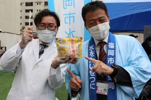 福岡市水道局の方と会場でコラボし、給水車の水を使い災害非常食を作る実演を行いました