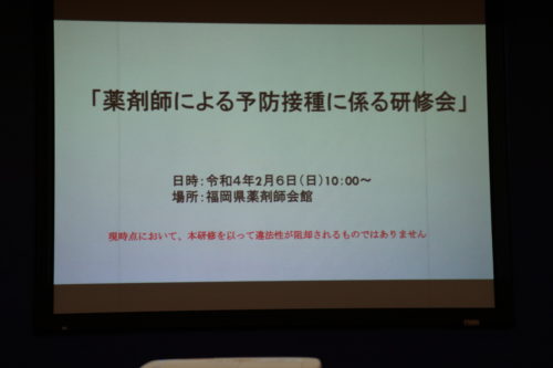 2月6日(日)福岡県薬剤師会館にて「薬剤師による予防接種に係る研修会」が開催され、福岡市薬剤師会からも地区推薦者(各支部1名)が参加しました。