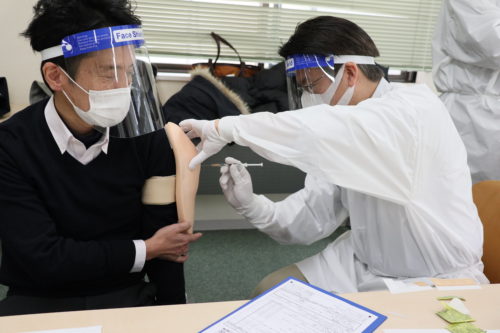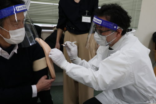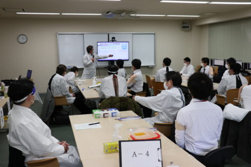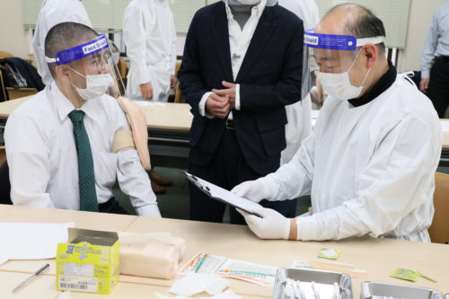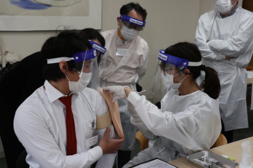 この研修会は、日本薬剤師会により提供された「薬剤師による予防接種研修プログラム」に基づき行われたもので、研修内容としては、ワクチンに関する動画視聴の講義があり、その後、2つのグループに分かれ、実技研修がありました。