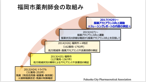 福岡市薬剤師会では、以前から残薬確認による服薬アドヒアランスの向上などを目的に節薬バッグ運動、またトレーシングレポートの推進と内容の検証をしており、今回はその取り組みを発表しました。