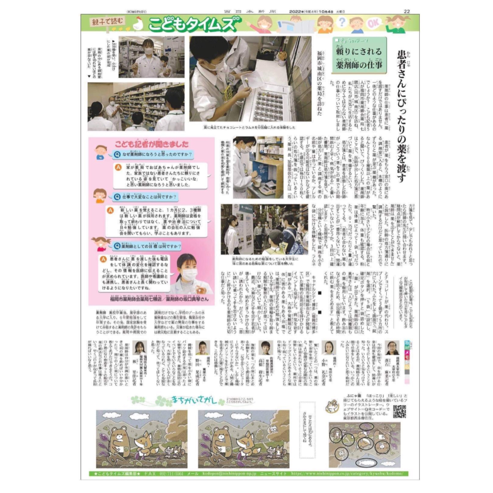 西日本新聞meこどもタイムズ「頼りにされる薬剤師の仕事 患者にぴったりの薬を渡す」2022.10.04