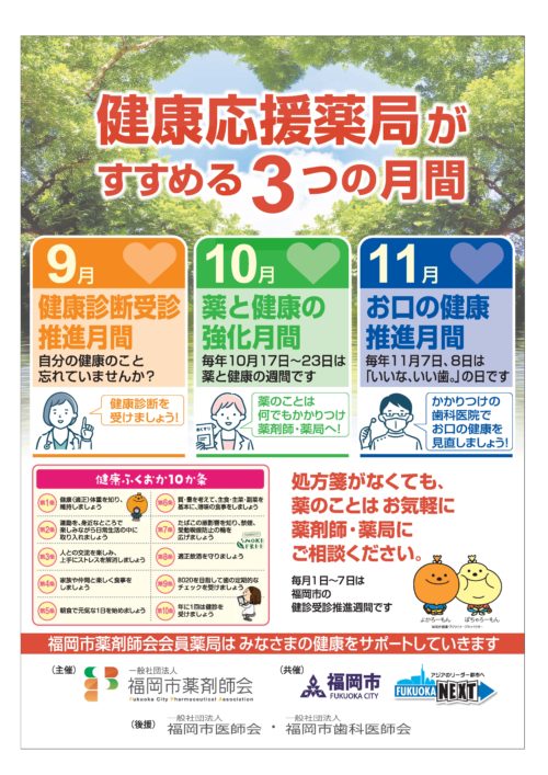 福岡市薬剤師会では、10月を「薬と健康雄の強化月間」としています。薬局は、処方箋がなくても気軽に入れる場所ですので、ご自身やご家族の健康や薬のことで気になることがあったら、お気軽に近くの薬局、薬剤師にご相談ください。