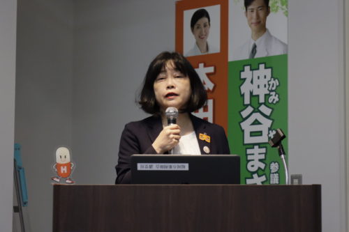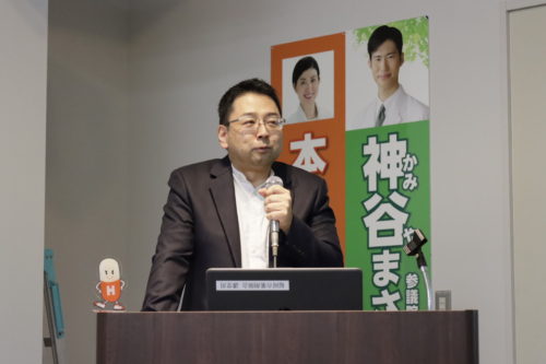 次に、「孤立死を防ぐために私たち薬局ができること〜地域住民と多職種とのつながりの中で見えてきたもの〜」と題し、(有)ウェルネスファーマシー やさしい薬局 勢島 英 先生に講演いただきました。勢島先生は、近隣の薬局、UR都市機構、福岡大学薬学部と協力し数年前から孤独死・孤立死を減らすため「宝台健康アカデミー」という活動を行ってあります。定期的に宝台団地集会所で、健康に関する講演や健康チェック、個別相談などを行ったり、チラシや健康通信の作成・配布などをされており、その活動や地域における薬局のあり方にについてお話いただきました。