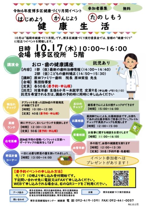 10月17日(木)に開催された博多区の健康イベント「はじめよう かんじよう たのしもう 健康生活」に博多区薬剤師会も参加をしてきました。