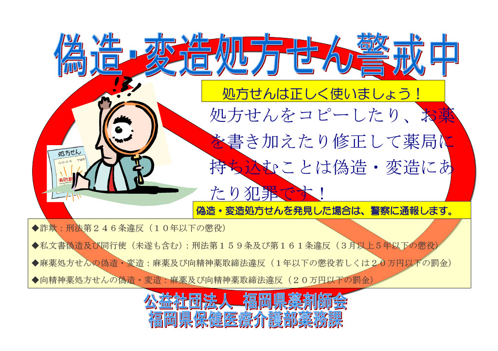 処方せんのコピー、内容の書き換えは、偽造・変造にあたり犯罪です!!