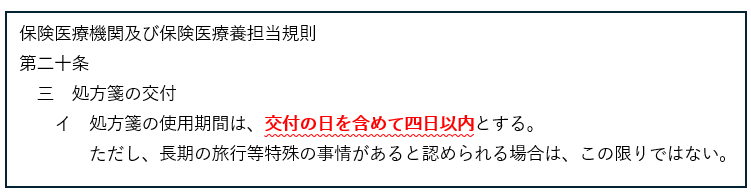 例えば、月曜日に発行された処方箋は木曜日まで、金曜日に発行された処方箋は翌週の月曜日までが使用期限になります。
