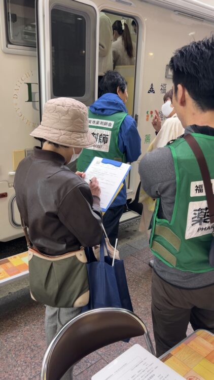 中央区薬剤師会は、福岡市・福岡市薬剤師会・第一薬科大学連携で所有する「モバイルファーマシー(MP)」を展示し、訪れる市民の皆さんに、MP車両の見学と機能解説、災害時の薬剤師活動、災害医療と医薬品の状況はどうなるか、お薬手帳の有用性などについて啓発できました。