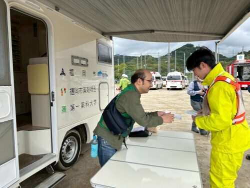 私たち福岡市薬剤師会は、安徳南小学校会場で、モバイルフアーマシーを用いた訓練を行いました。
