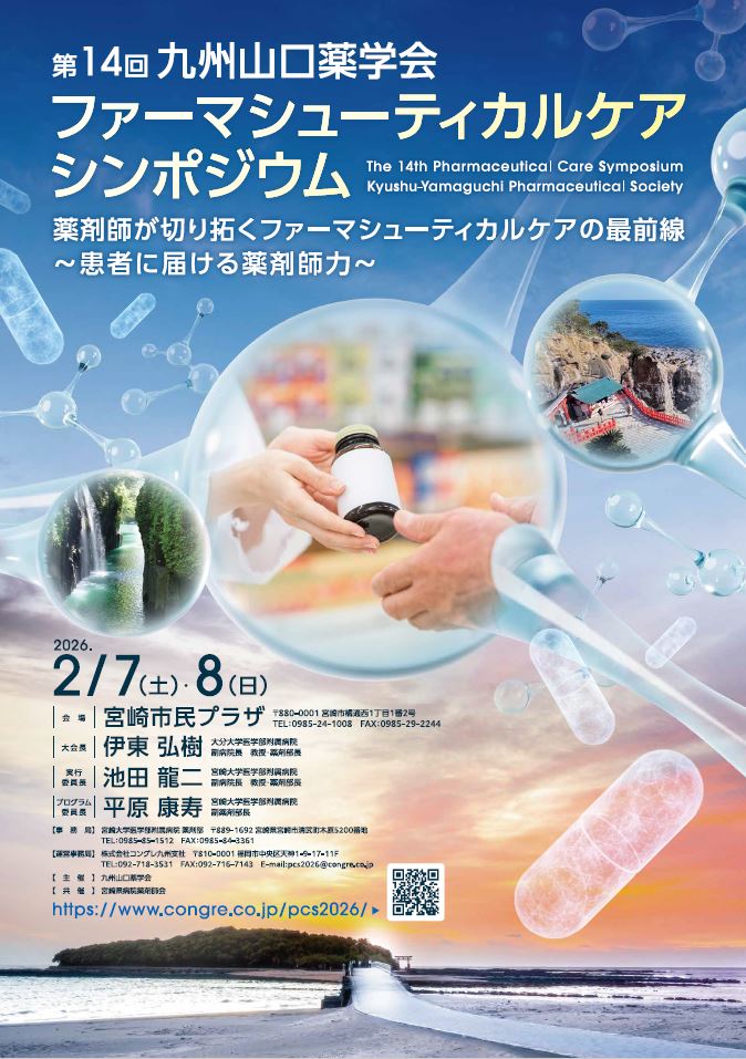 九州山口薬学会より2026年2月7日・8日開催の「第14回九州山口薬学会ファーマシューティカルケアシンポジウム」のご案内がございましたのでお知らせします。