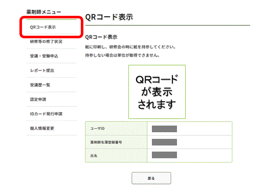 1.「薬剤師メニュー」から「QRコード表示」をクリックすると、QRコードが表示されます