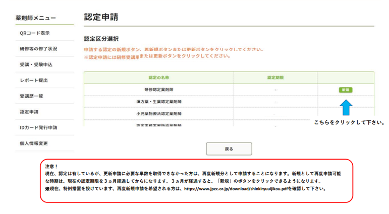 1.「薬剤師メニュー」から「認定申請」をクリック