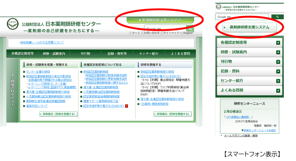 1.「日本薬剤師研修センター」ホームページから「薬剤師研修支援システム」へ進む