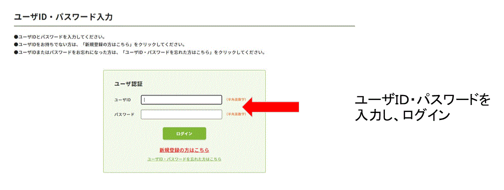 3.「ユーザ認証」へ「ユーザID」「パスワード」を入力し、ログインをクリック