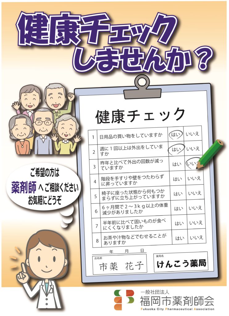 2024年5月15日 フレイル予防相談事業 事務局 フレイル・ロコモ予防相談事業を進めるため 健康チェック 9項目のポスターと記録用紙を作成しました フレイル・ロコモ予防相談事業を進めるため 健康チェック 9項目のポスターと記録用紙を作成しました ■ ダウンロードしてお使いください(各薬局へ送付済み) ■記録用紙を掲載しています。こちらは各自ダウンロードしてください。 ↓ ダウンロード ↓ ダウンロード ※福岡市薬剤師会が行っている「フレイル予防相談事業」については、コチラをご確認下さい。 「フレイルチェック25」等の資料等を掲載しています。